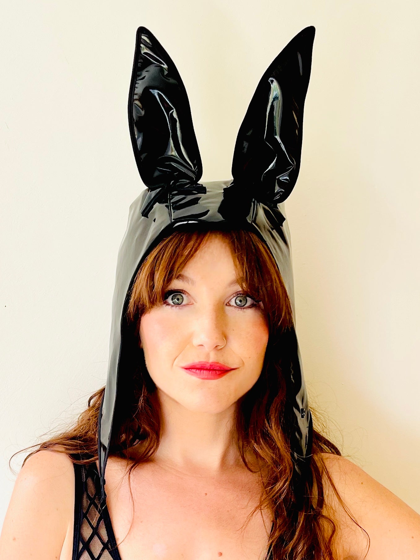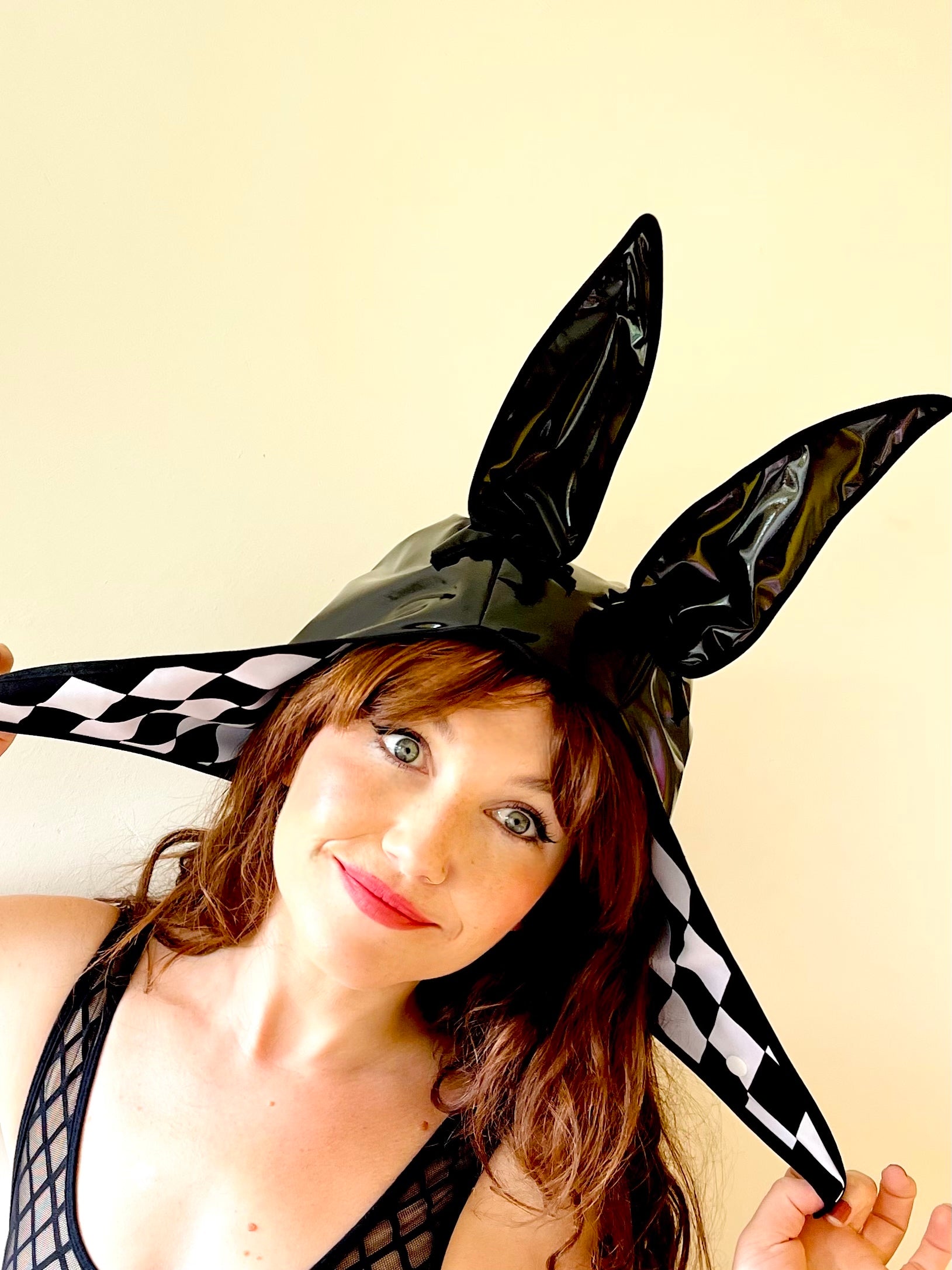ANIMORPH hood with bendable bunny ears on one side and a chic printed fabric on the other!