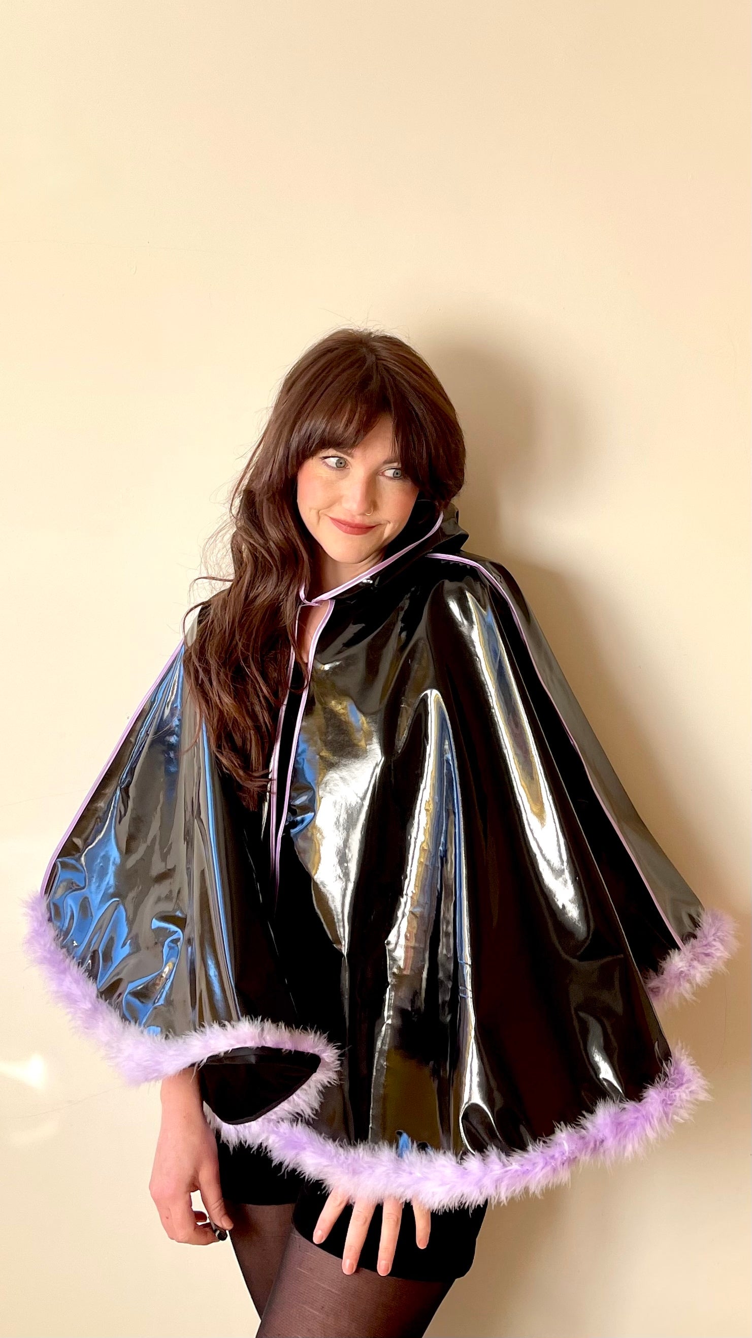 Black PVC 'CYCLONE' cape with lilac feather trim