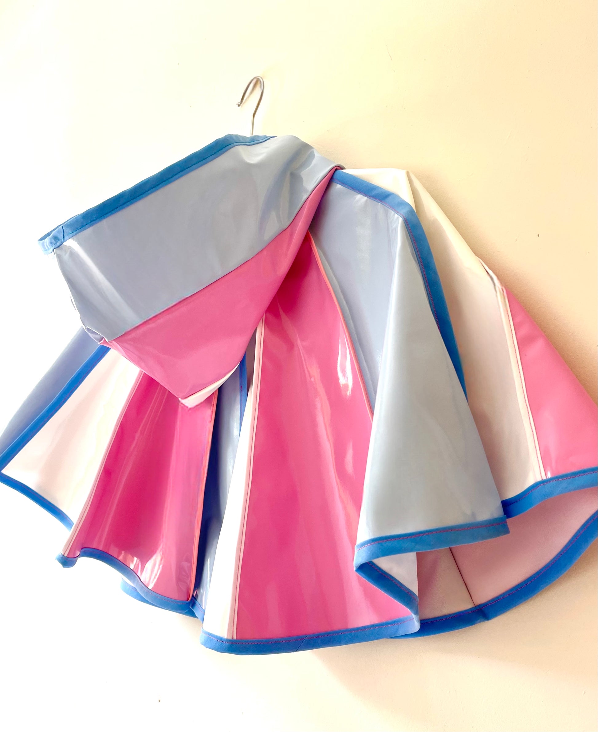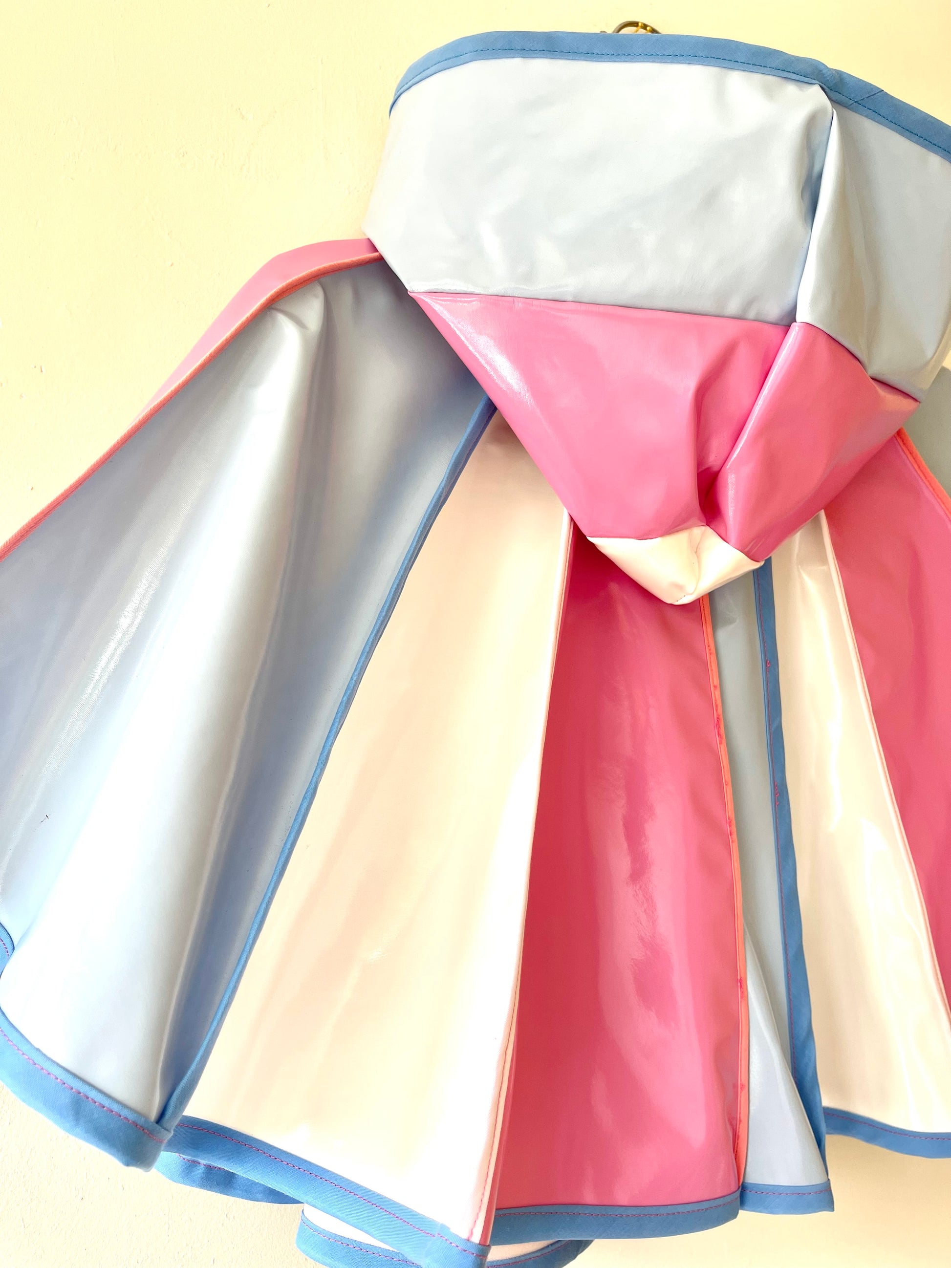 Colourway: Pale pink, pale blue and white vinyl PVC beautifully stitched together with blue piping.