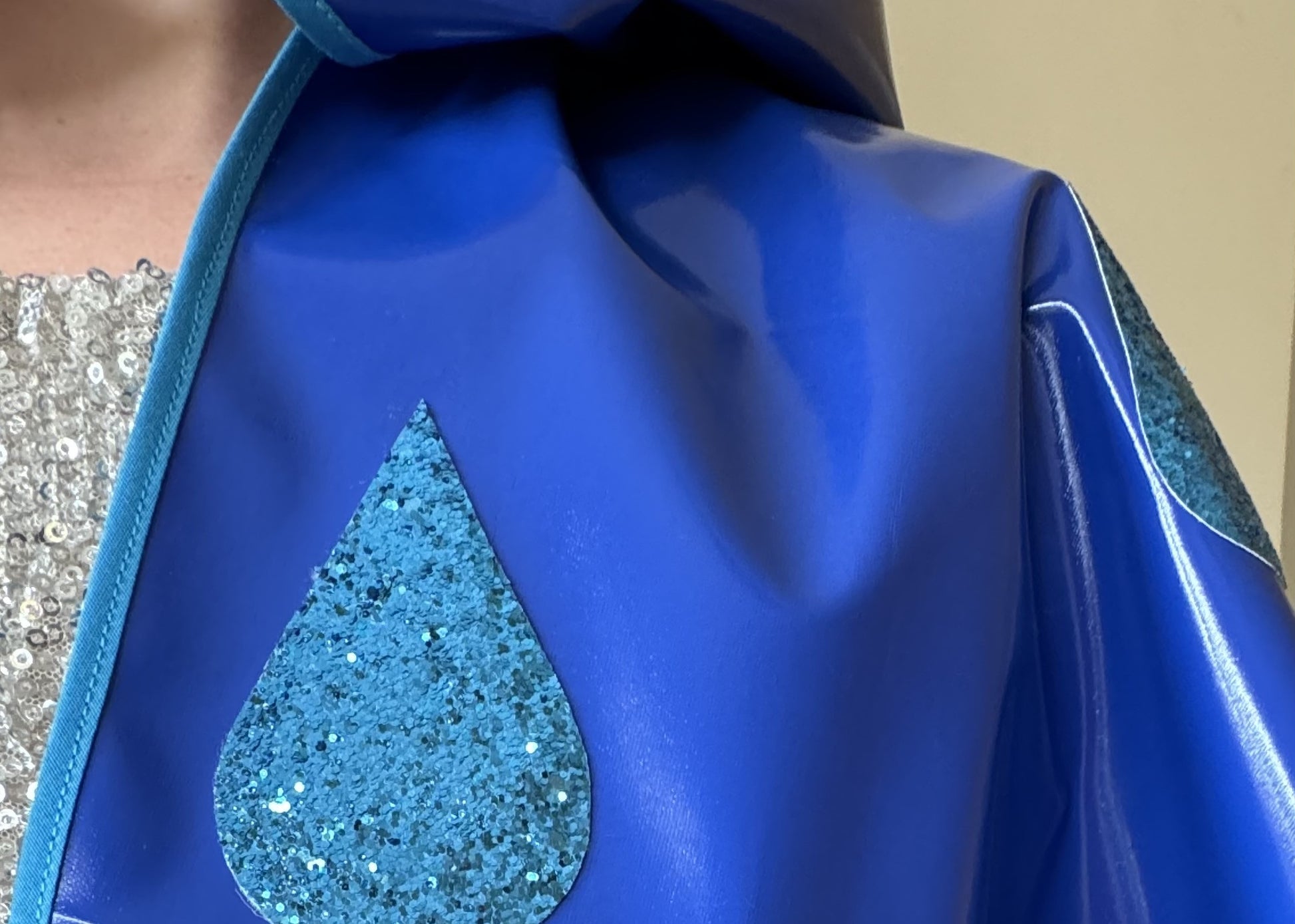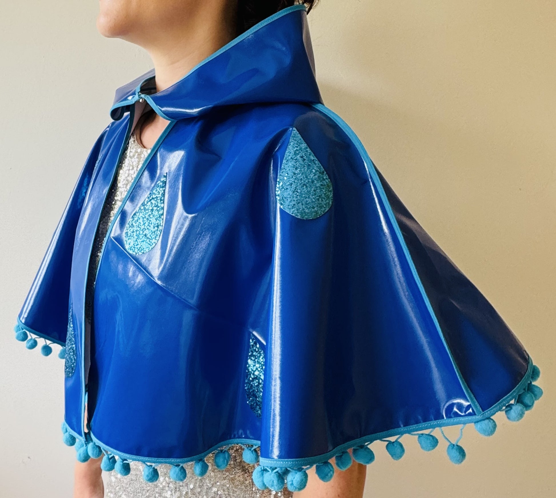 CYCLONE Blue cape, blue glitter raindrops & pompom trim