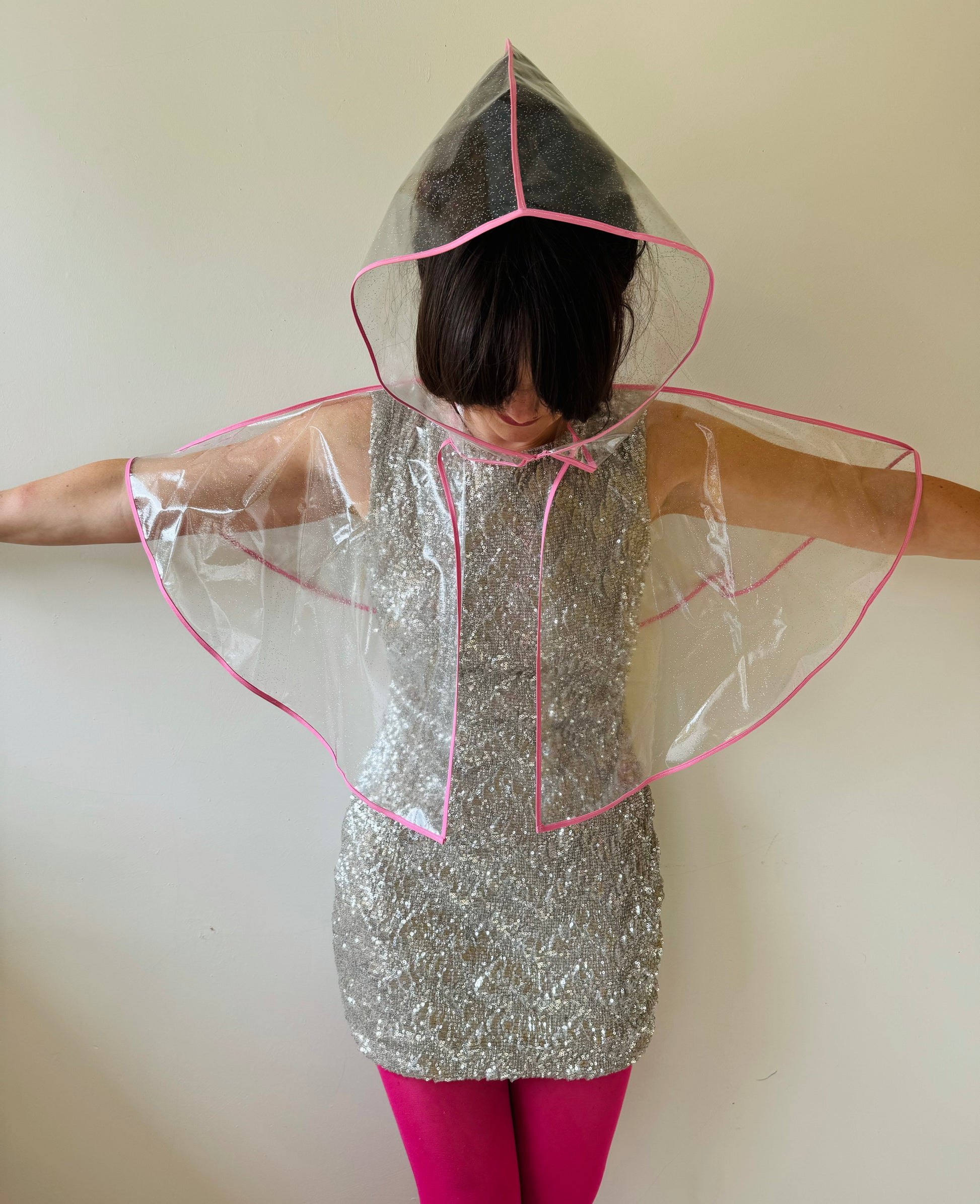 This exquisitely tailored, PVC hooded cape will protect you from the elements, whilst also looking chic enough to pair with the neatest of outfits!The hook and eye closing means you can be hands-free and allows for beautiful movement whilst you twist, shimmy and strut!
