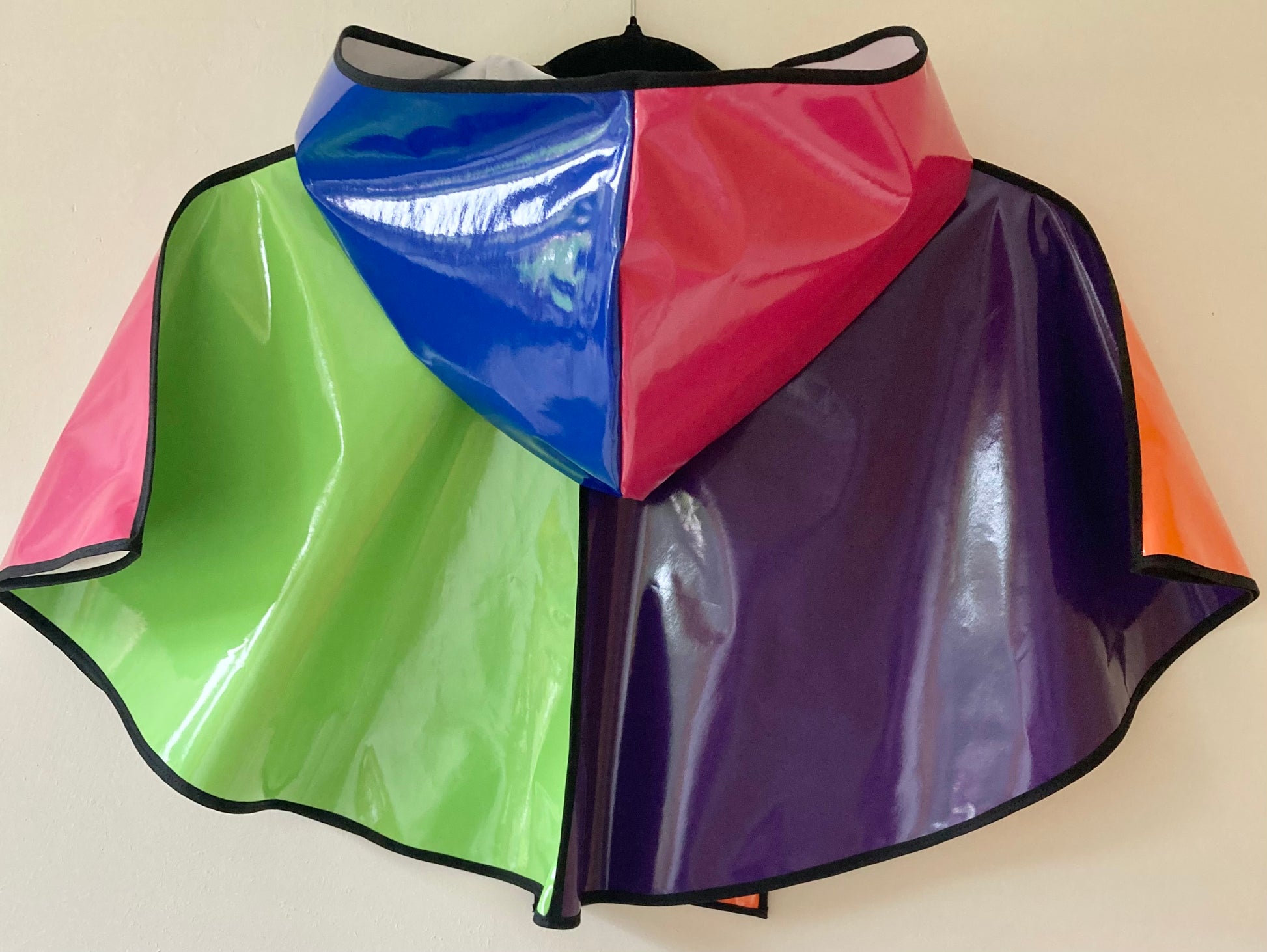 This exquisitely tailored, PVC hooded cape will protect you from the elements, whilst also looking chic enough to pair with the neatest of outfits!The hook and eye closing means you can be hands-free and allows for beautiful movement whilst you twist, shimmy and strut!