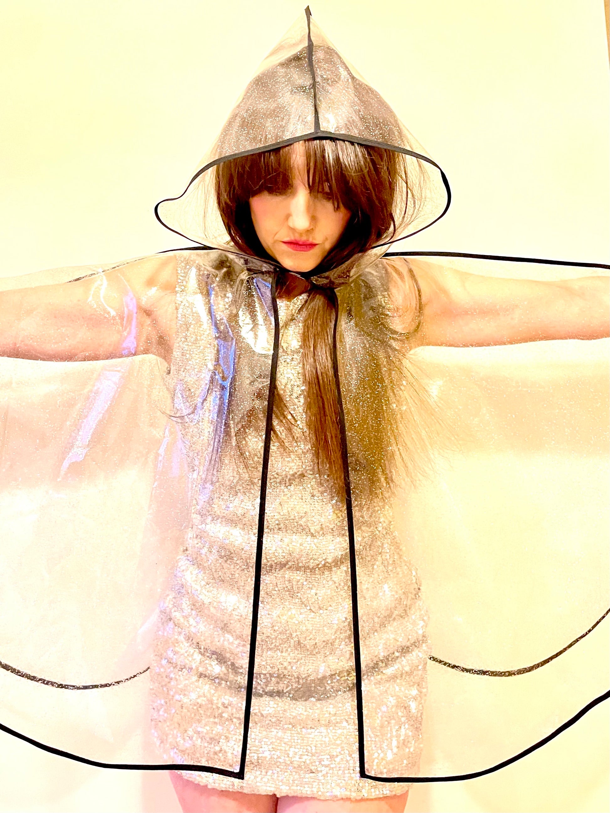 This exquisitely tailored, PVC hooded cape will protect you from the elements, whilst also looking chic enough to pair with the neatest of outfits!The hook and eye closing means you can be hands-free and allows for beautiful movement whilst you twist, shimmy and strut!