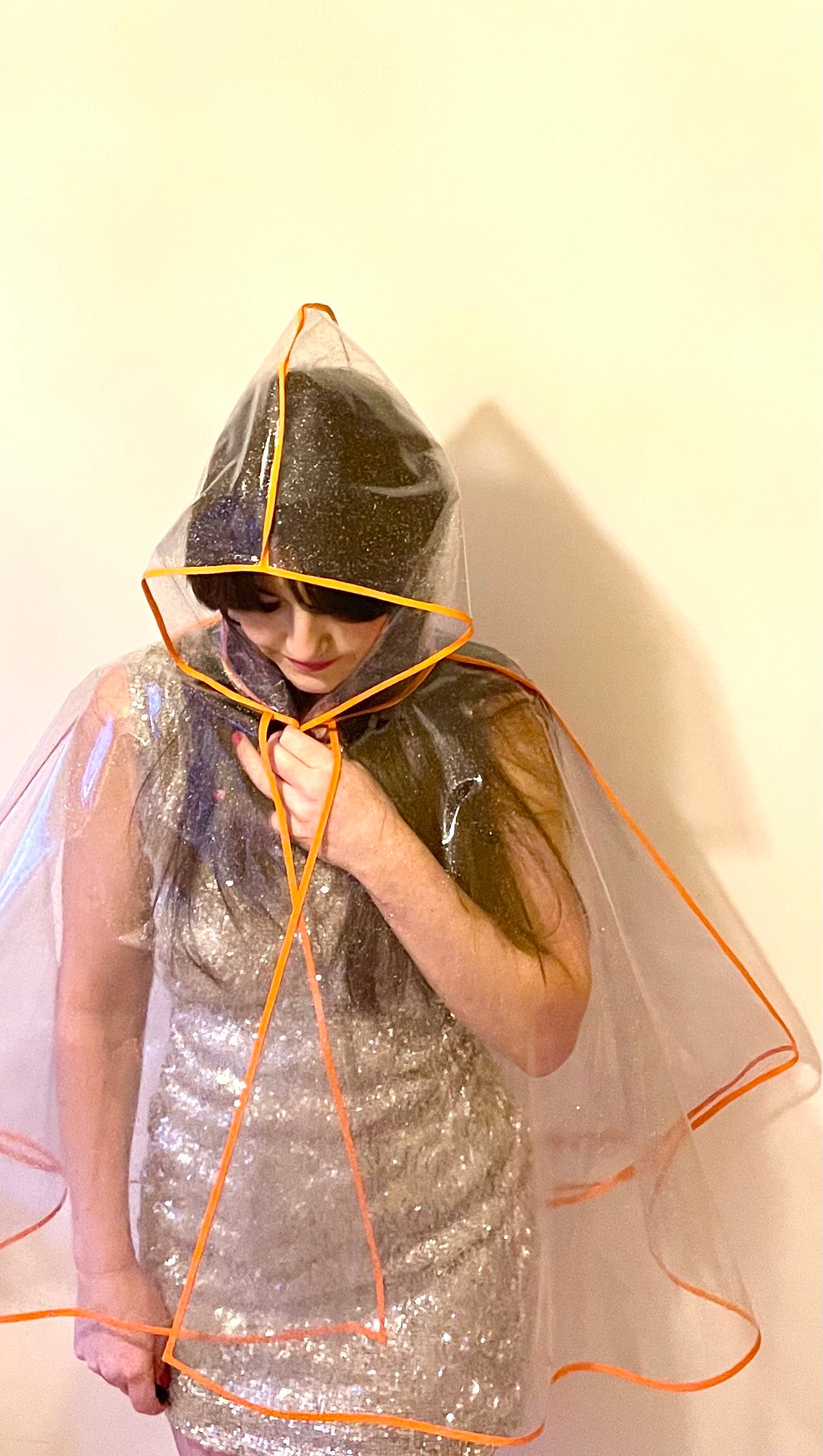 This exquisitely tailored, PVC hooded cape will protect you from the elements, whilst also looking chic enough to pair with the neatest of outfits!The hook and eye closing means you can be hands-free and allows for beautiful movement whilst you twist, shimmy and strut!
