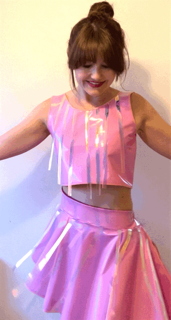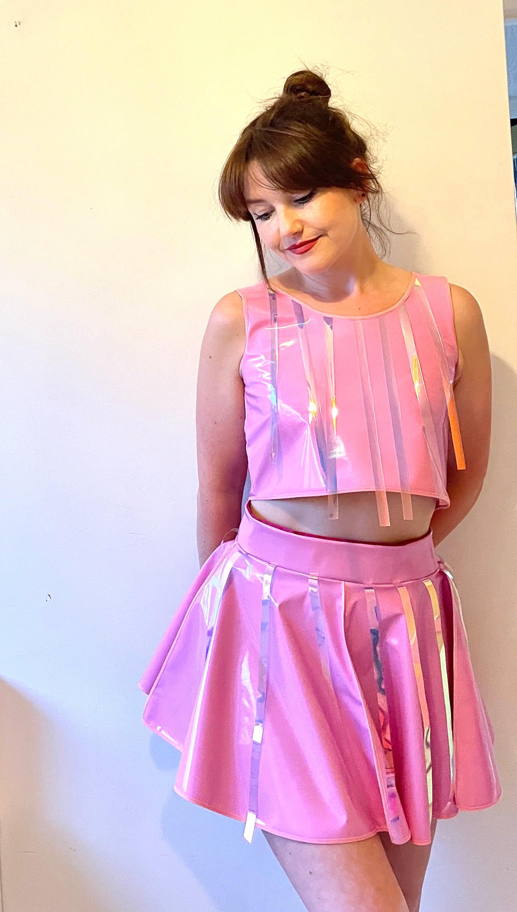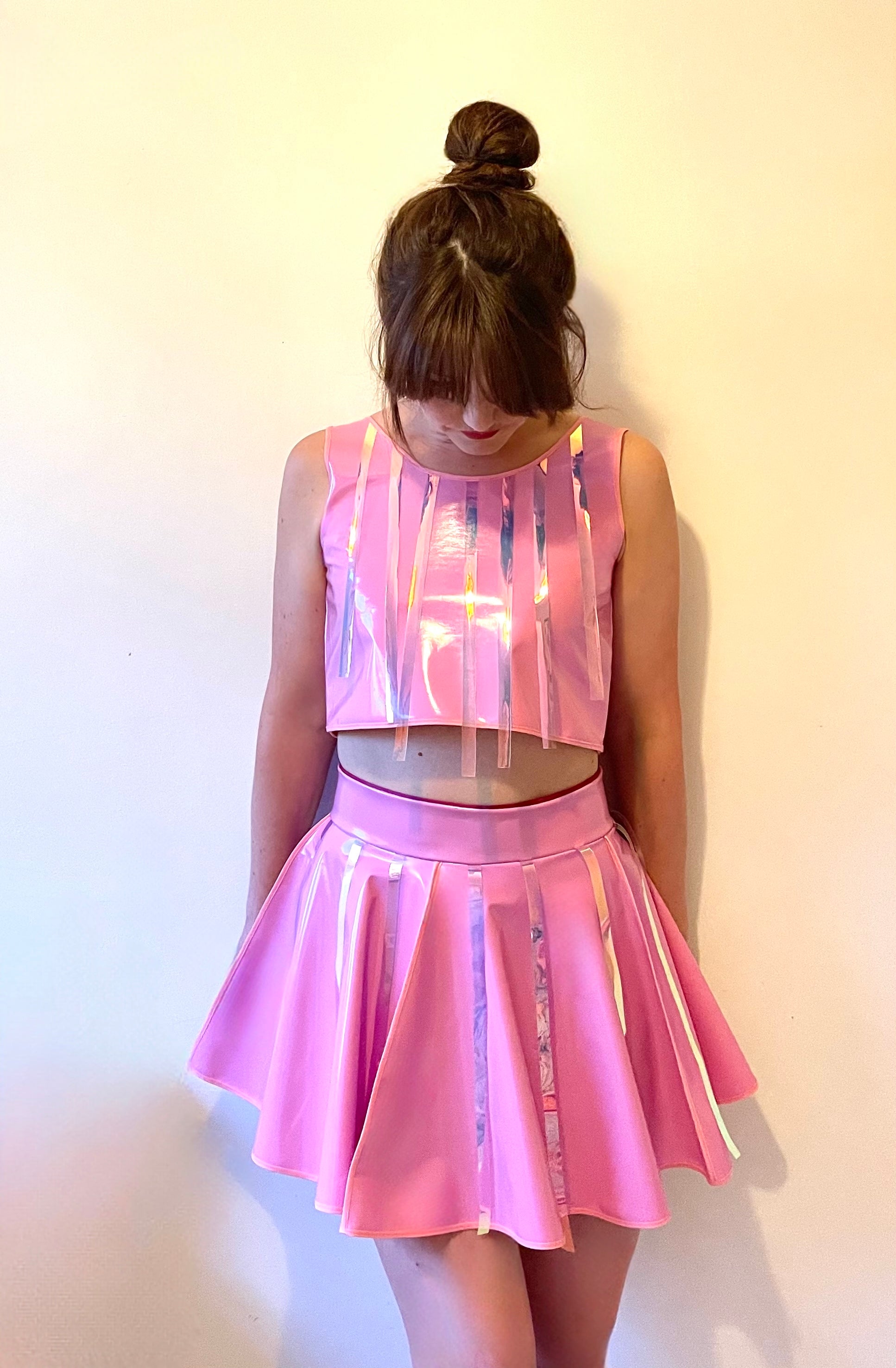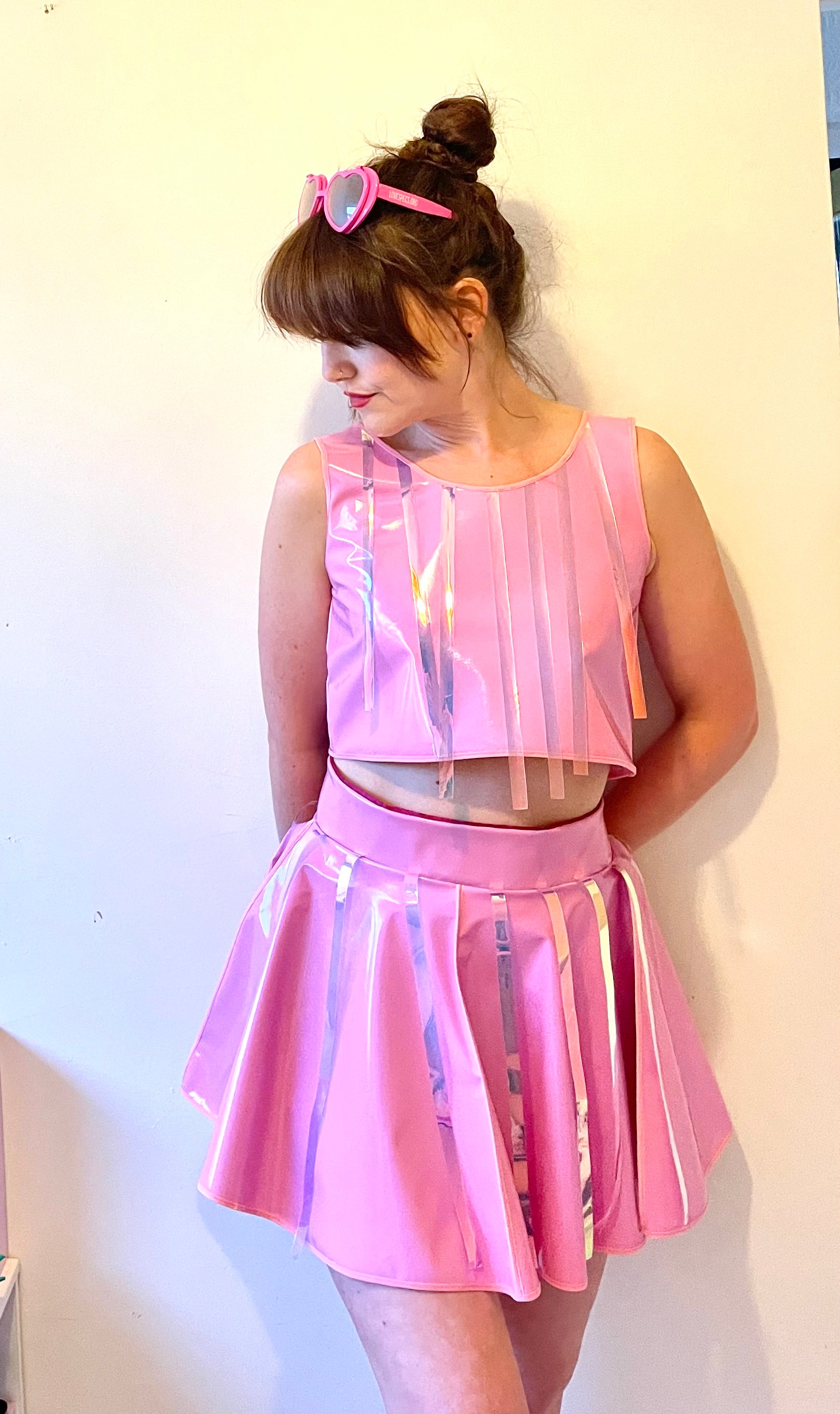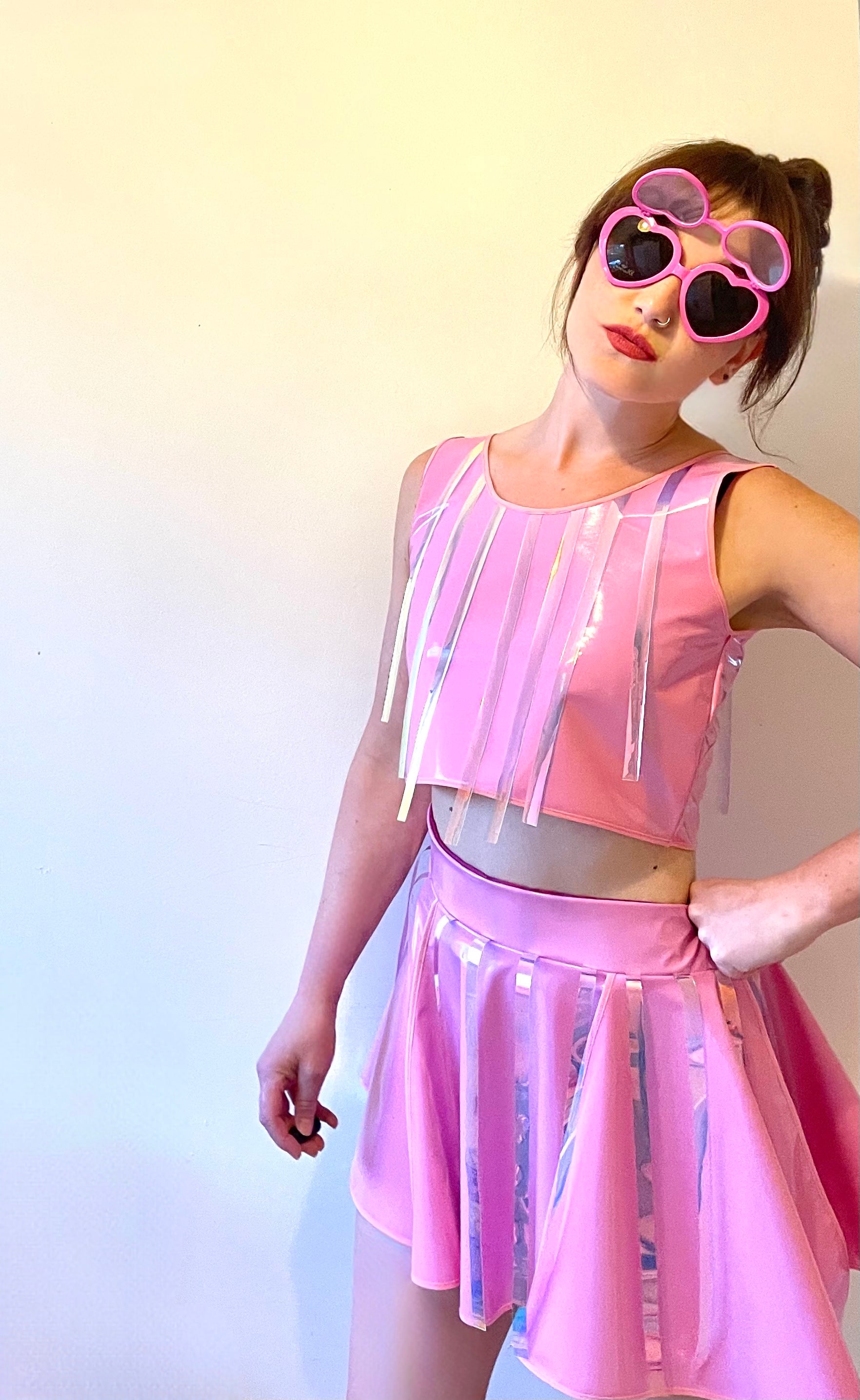 Colourway: Pink PVC with iridescent fringe embellishment and pink piping.